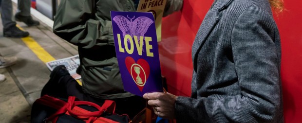 CCA members Phil Kingston and Ruth Jarman, holding a sign of ‘Love’ at the Canning Town action