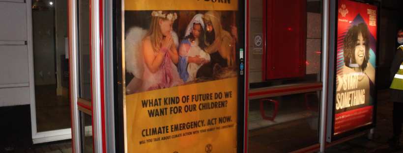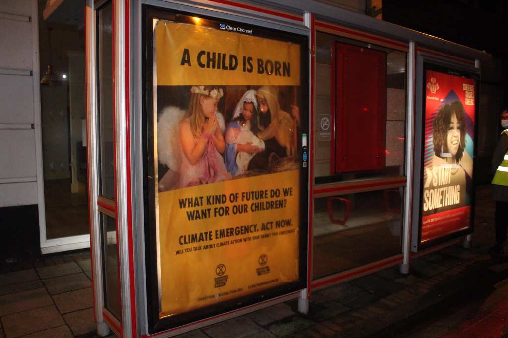 Across the country Christian Climate Action members put up posters in bus stops on top of the advertising that was already there. Posters have also appeared on noticeboards and in windows. As the photos below show, an image of a school nativity play is accompanied by the words “A Child is Born. What kind of future do we want for our children?” The poster urges the reader to act now in the face of the Climate Emergency, including discussing the emergency with wider family over Christmas.