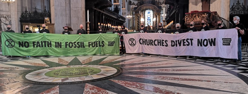 Those taking part in the action at St Pauls acknowledged that the Church Commissioners have agreed to begin divesting from fossil fuel companies not aligned with the Paris Agreement in 2023. However, they contend that companies like Shell are still committed to future fossil fuel exploration and that there are very few signs that they will align themselves with the Paris Agreement. As the recent IPCC report states very starkly – humanity is running out of time!