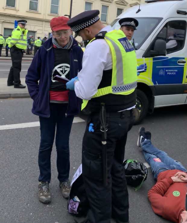 We waited a long time before being taken to a police station and I had the opportunity to talk with the arresting officer about why we were there. I hope he was able to see me as I saw him: a fellow human being. I felt that I had been well prepared for what would happen once we arrived at Charing Cross police station. We were well cared for; I was allowed to keep with me the photo of my grandson and it was wonderful to hear fellow XR arrestees singing call and response to each other from their cells. On our release, we were met by a lovely XR person with snacks and more love.