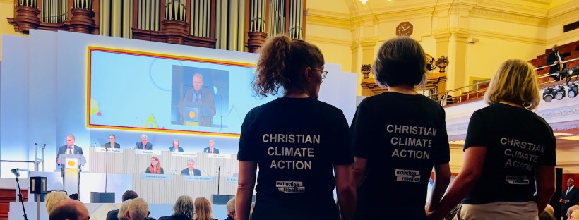 Over 70 protesters, including members of Christian Climate Action, had each purchased just one share to give them the right to attend Shell’s AGM on 24th May. They brought the meeting to a standstill with a co-ordinated protest that alternated singing and well-researched statements. These highlighted how Shell had known for decades that it was contributing to climate and ecological breakdown, how its oil production had destroyed vast areas of natural habitat, including in the Niger Delta, and its association with the execution of nine climate activists by the Nigerian Government. Protestors appealed to Shell to consider the impact the company’s activities would have on future generations, including the Board’s own children and grandchildren.