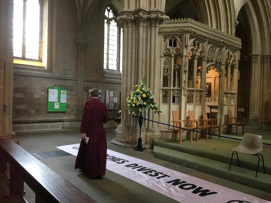 ‘How could I not take part? I find it deeply shocking that many Dioceses in the Church of England, knowing all that they do as to the lethal effect of fossil fuels on all life on earth, are nevertheless prepared to gain financially through their continuing investment in the industry. The Church in all its forms needs to be taking a prophetic stand and calling on the Government to end all new exploration. How can it do this when it continues to benefit in such a direct and obvious way, as does the Diocese of Bath & Wells?’