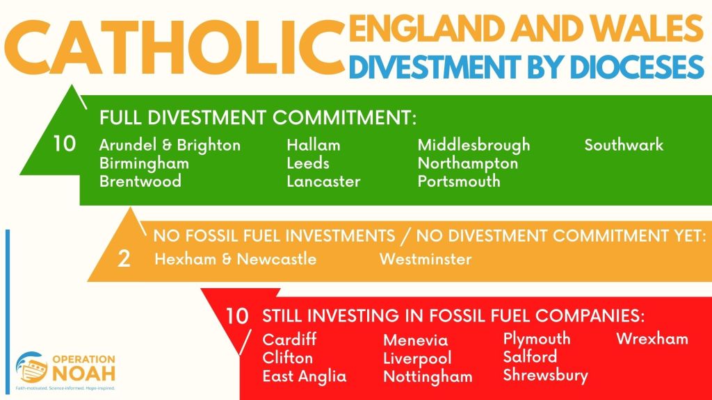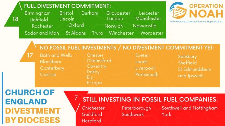 These infographics from Operation Noah show which dioceses in both churches still hold investments in fossil fuels. NB: All Scottish dioceses in the Catholic Church have committed to divest and so are not listed here.