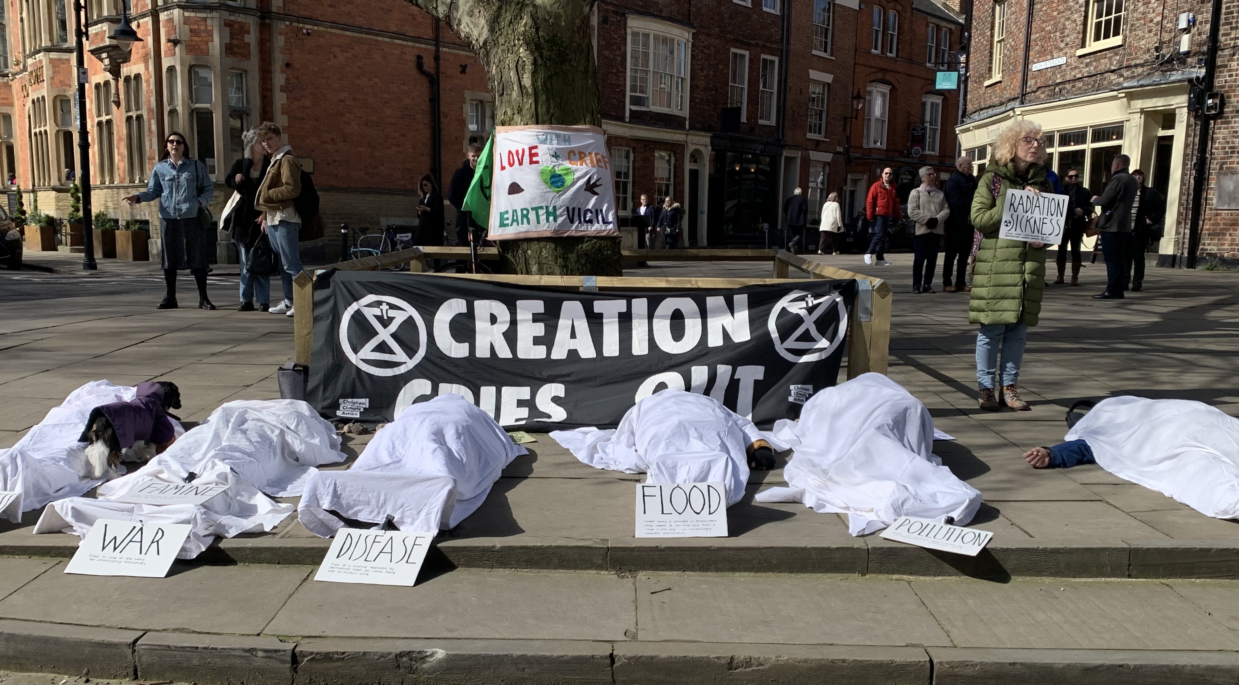 The candle-lit vigil included the reading of prayers for Creation and banners with the words: CREATION CRIES OUT and NO FAITH IN FOSSIL FULES. The group also carried out a ’die-in’ outside the Minster, to highlight the human tragedy of the climate emergency. This involved people lying on the ground, covered in white sheets, representing those people in the global south, who have died, and will continue to die as a direct result of global warming. Placards were put next to the ‘corpses’ naming the different causes of death through climate change – famine, suicide, flood, wildfire, drought.