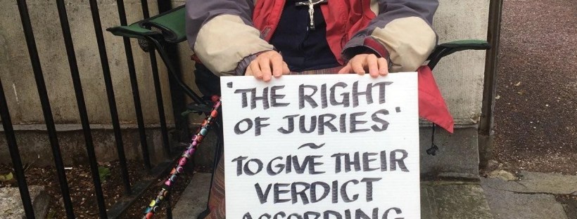 integrity, so I expect to see it in public life. I am deeply troubled threefold: that defendants whom I personally know and respect have been sent to prison for telling the truth; that the rights and duty of jury members to decide their verdict on the basis of their collective individual consciences have not been upheld – thereby compromising the fundamental human right to trial by jury; and that those who have sought to uphold jury members’ rights to act on the basis of conscience, have been arrested.”