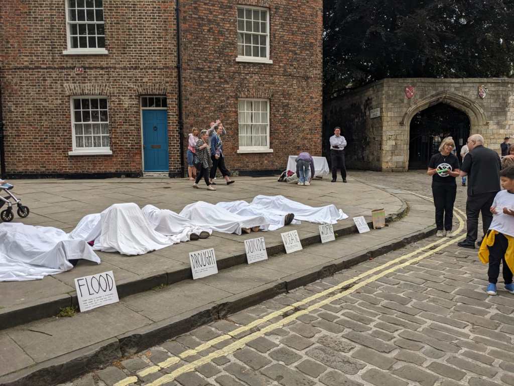 On the Sunday morning members of Christian Climate Action were outside of York Minster, where Synod members were having their morning worship. York is one of the few Anglican dioceses that are still investing in fossil fuels. We carried out a ‘die-in’ outside the building as Synod members were entering. This involved people laying down on the floor under white cloths, representing the people around the world who have already lost their lives to climate breakdown.