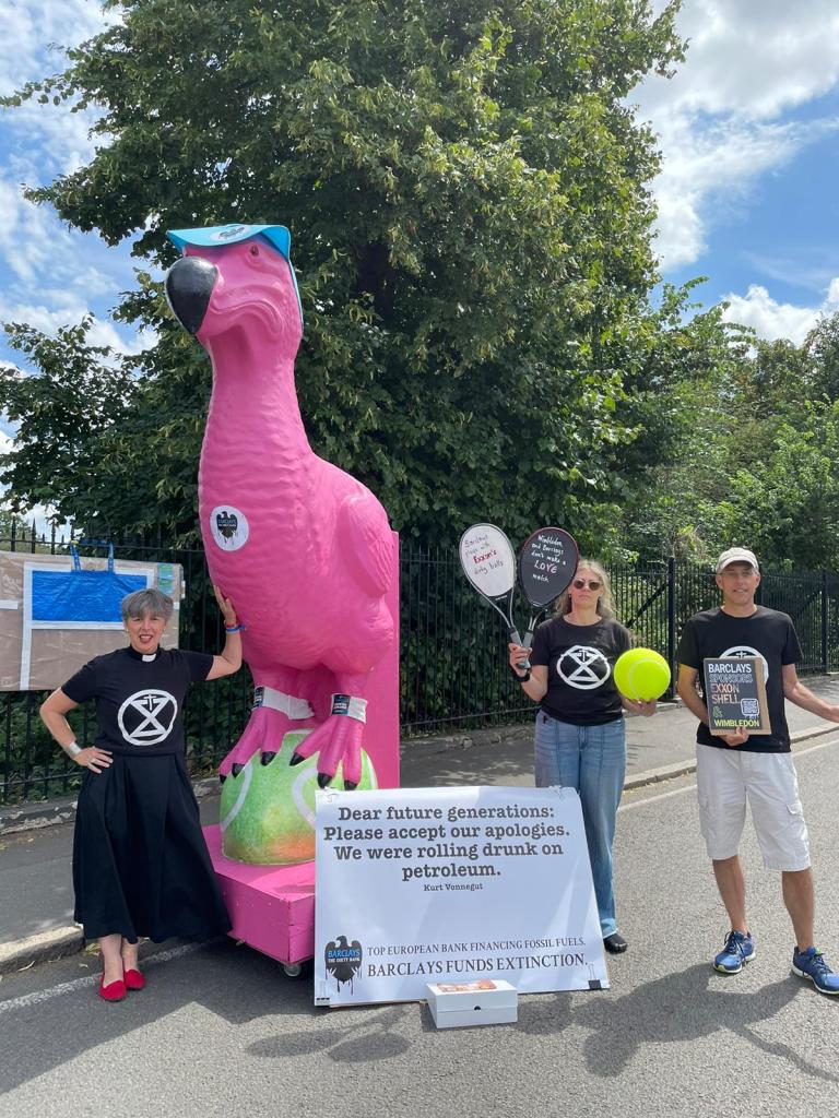 We have been working alongside other groups, such as Make My Money Matter and Fossil Free London. We have been handing out flyers to individuals in the queue to enter the stadium and have been putting up posters in the surrounding area. We have also been doing creative actions such as wheeling around a huge pink dodo, sitting on a tennis ball, which was created by Money Rebellion. The dodo represented the extinction that human race is heading for if we carry on with business as usual.