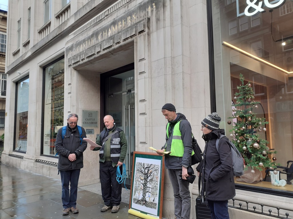 And then Christian Climate Action held a prayer walk in Liverpool on 5th December, the day when COP28 focussed on Energy, Just Transition and Indigenous Peoples. The walk started at 11 am outside an HSBC pop-up bank, stopped at a number of premises in the city and ended at No1 Mann Island, office of Seadrill (oil and gas rig leasing). Outside each stop a statement was read linking the site to the Climate and Ecological Emergency, followed by prayer.