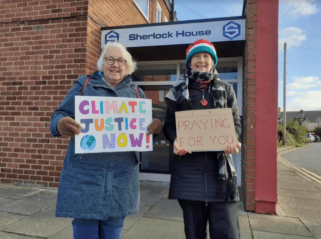 The two members of CCA spent an hour outside Dame Angela Eagle’s office in Sherlock House, Wallasey. They spoke to passersby and prayed. They used a mixture of Christian Aid prayers, extracts from Laudate Deum and silent prayer.
