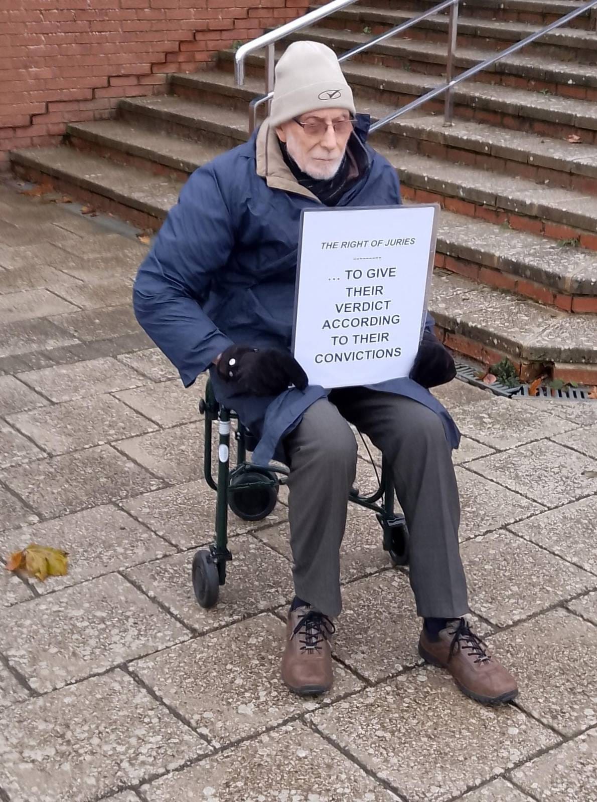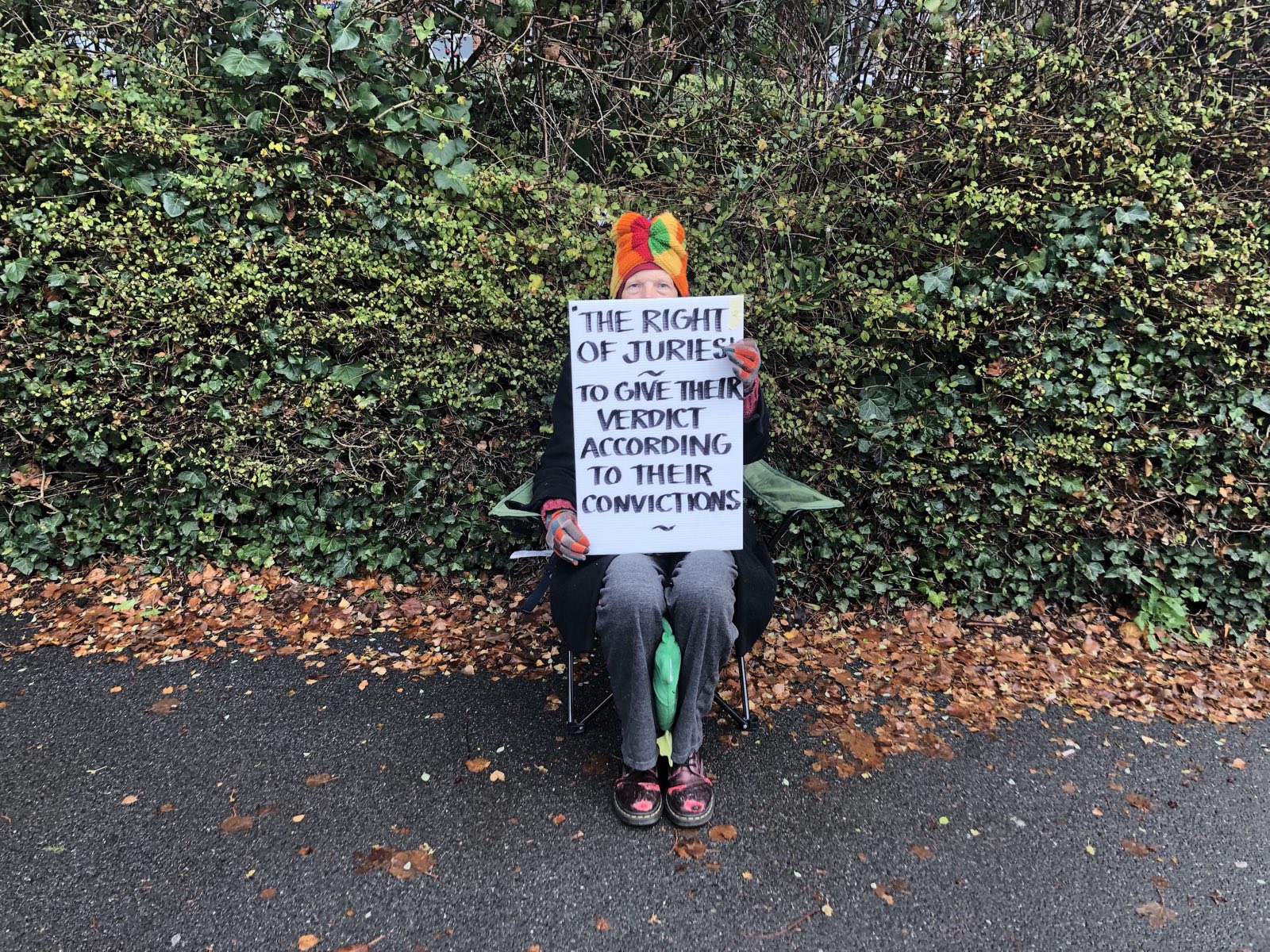 Trudi Warner (aged 68), the first person to hold a sign up outside court protesting against this, was arrested and now faces trial. Dozens of others who followed suit in defence of her stand have been referred to the Attorney General and were summoned for interview by the police. Nevertheless, with over 400 people taking part of this latest action, the defence of freedom of speech, the power of the jury and justice in our courts, goes on.