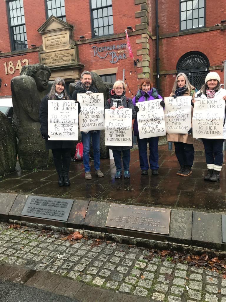 Each protestor held a sign referencing words carved above the doors of the Old Bailey, which enshrine the rights of juries to reach a verdict according to their conscience.