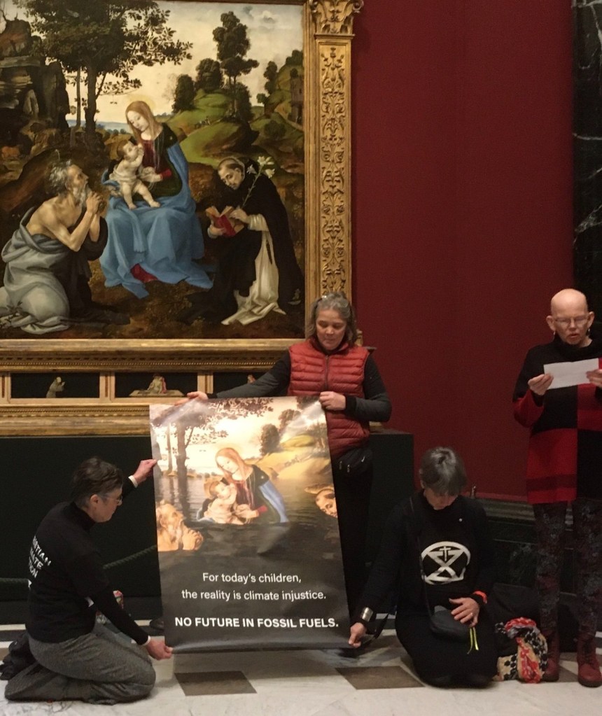 Five women today held a nativity-themed climate change protest inside the National Gallery in London. The members of Christian Climate Action stood in front of a 15th-century Filippino Lippi painting of the Virgin and Child which depicts Mary seated in a landscape feeding Jesus. They held a poster of the painting altered to show a climate-ravaged landscape and handed out postcards with this image and some facts about the impact of the climate crisis on the world’s children.
