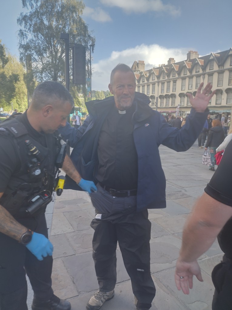 L: Rev Bill White, 70, being arrested. R: banner at Bath Abbey