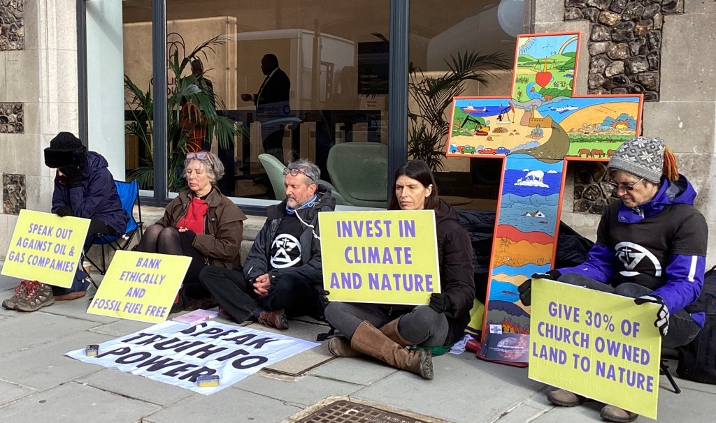 Banners urged the Church of England to “Speak Truth to Power” and “Don’t Crucify Creation”, and protestors held up placards with demands from the Stop Crucifying Creation vision document including “Speak out against oil and gas companies”, “Bank Ethically and Fossil Fuel Free,” “Invest in Climate and Nature” and “Give 30% of Church land to nature.”