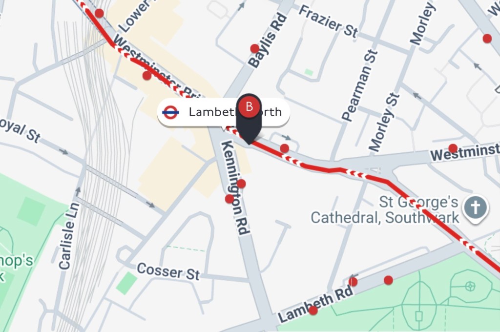 Lambeth North to Marble Arch on the tube (Bakerloo line to Oxford Circus, change to Central Line) will probably take around 35-40 minutes if you walk at a reasonable speed. This includes a 5 minutes walk from church to station and about 10 minutes from Marble Arch down Park Lane. Neither Lambeth North nor Marble Arch are step-free.
