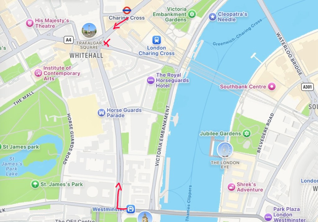 This is where both the main and the short routes will end. See above for information about Westminster and Charing Cross stations which are the two nearest.