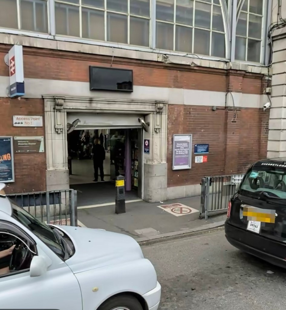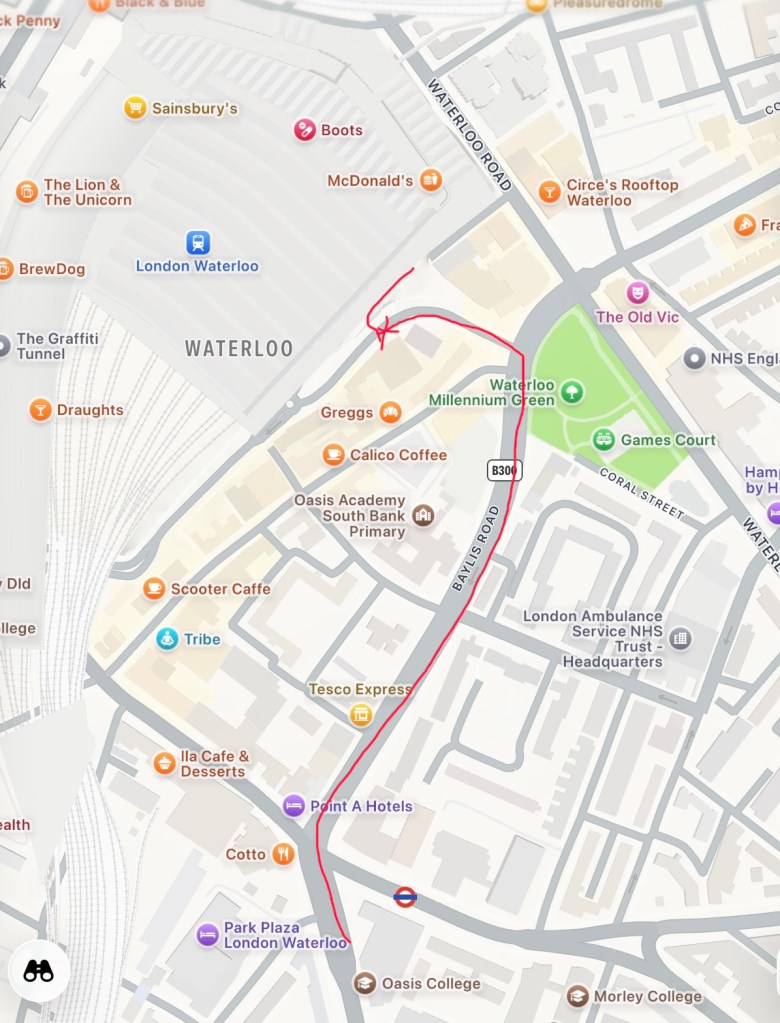 Map and photo below shows the accessible route from the church into Waterloo station concourse. There is a ramp approximately where we have marked the X.