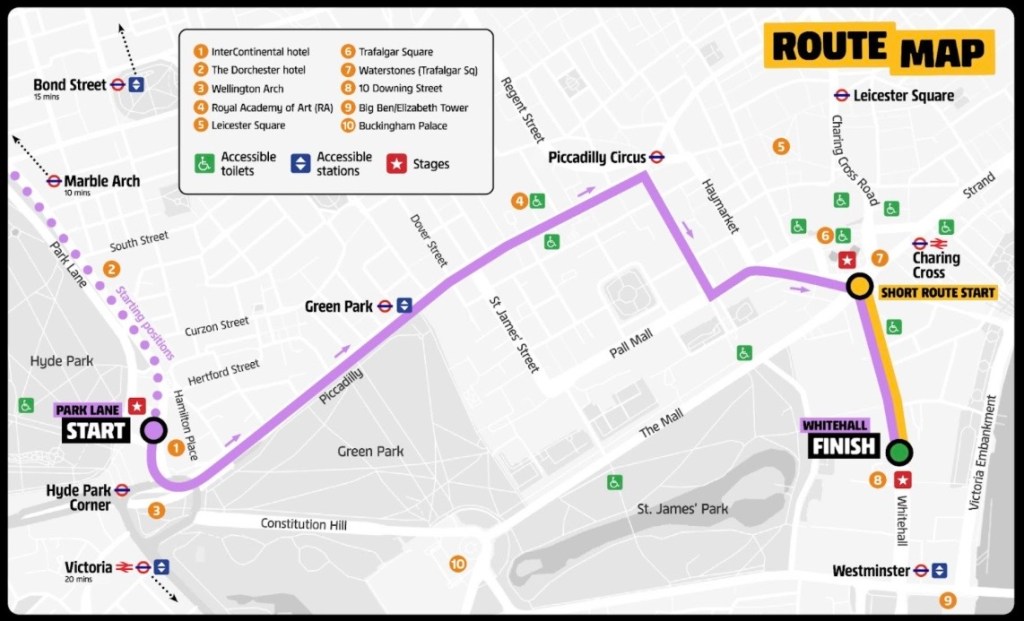 Waterloo to Green Park on the tube is slightly longer and involves more walking however there are no changes (just the Jubilee Line between the two stations) and both stations are step free, although wheelchair users may need a small platform ramp and we are told that platform staff will be there to assist. It will take around 40-45 minutes if you are not using the step free access to access the platforms (allow extra time to walk and for the lifts if you are). This includes a 10 minutes walk between the church and Waterloo station and a 20-25 minute walk to get to the meeting point on Park Lane. If the walk on Park Lane is too much, there is an accessible starting zone near the front of the march, outside the Intercontinental Hotel, 1 Hamilton Place, W1J 7QY. This is only 10 minute walk from Green Park station, along Piccadilly.