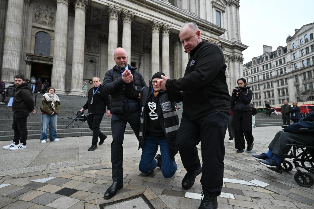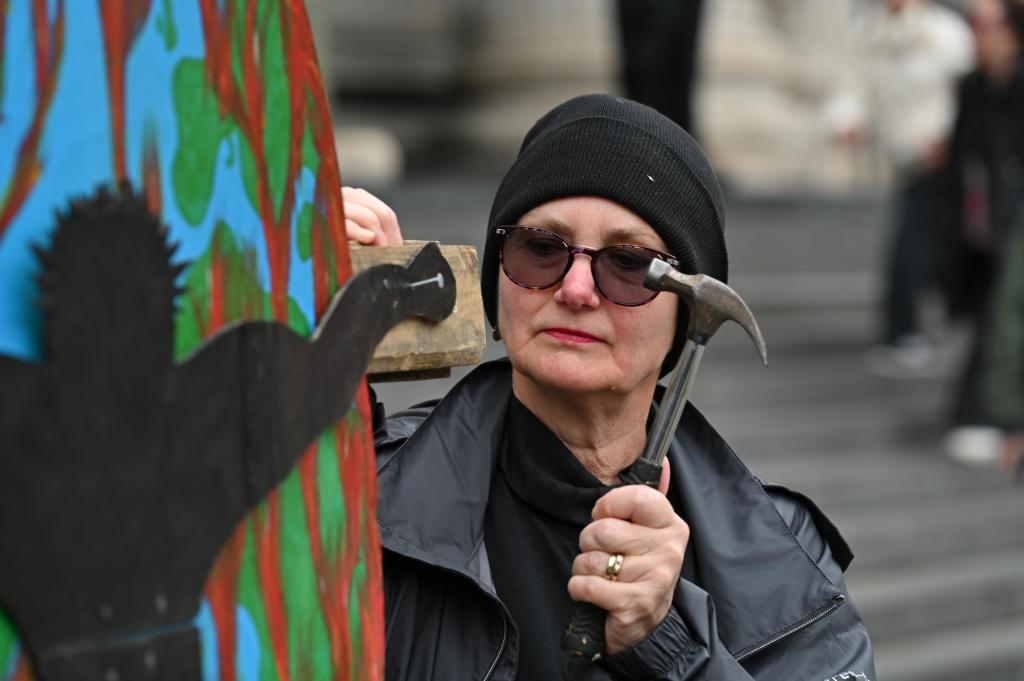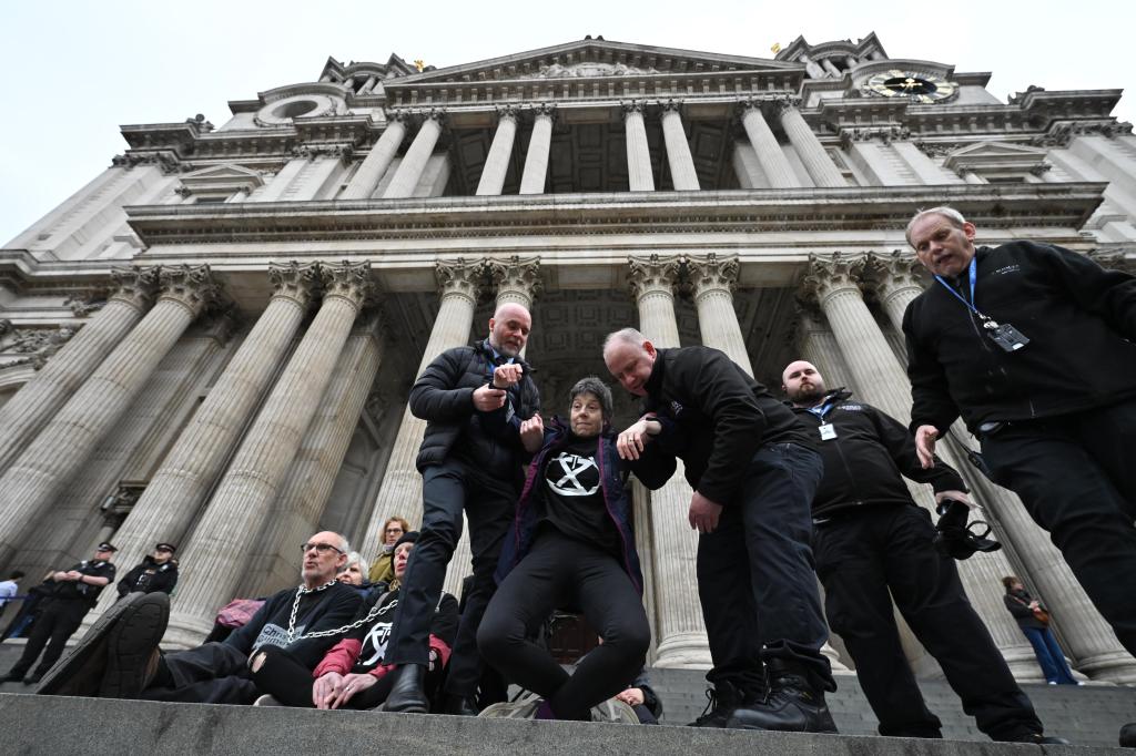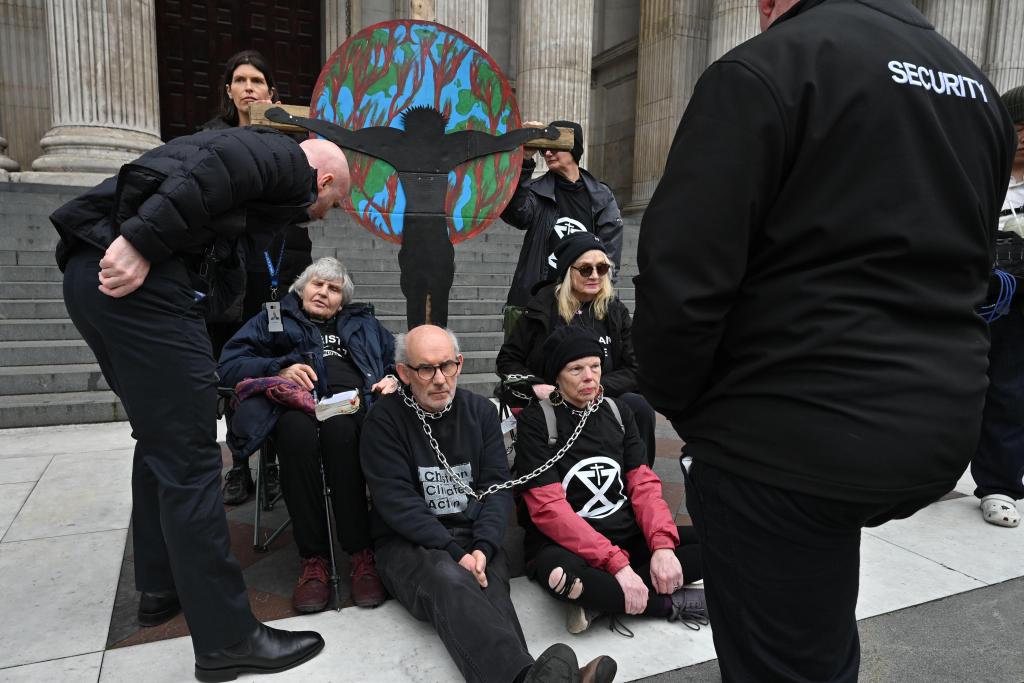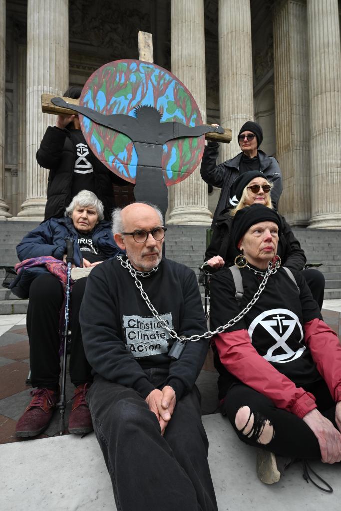 James Grote, 69, a Baptist Minister, Sue Parfit, 84, a Church of England Priest, Sue Hampton, 69, a writer, and Deborah Wilde, 71, a retired teacher, chained to the wooden cross. Four other people held a banner reading ‘Don’t Crucify Creation’ and held up the cross. The group sang in worship before they were each carried off the steps by Cathedral security.