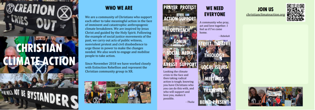 The main leaflet that Christian Climate Action members are using currently is the one below. It is a 4 sided A6 flyer which explains who we are an invites people to join us. On the back there is a blank square where you can write in the details of what you are inviting people to – whether you are inviting people to join your local group or inviting them to an event you are running.